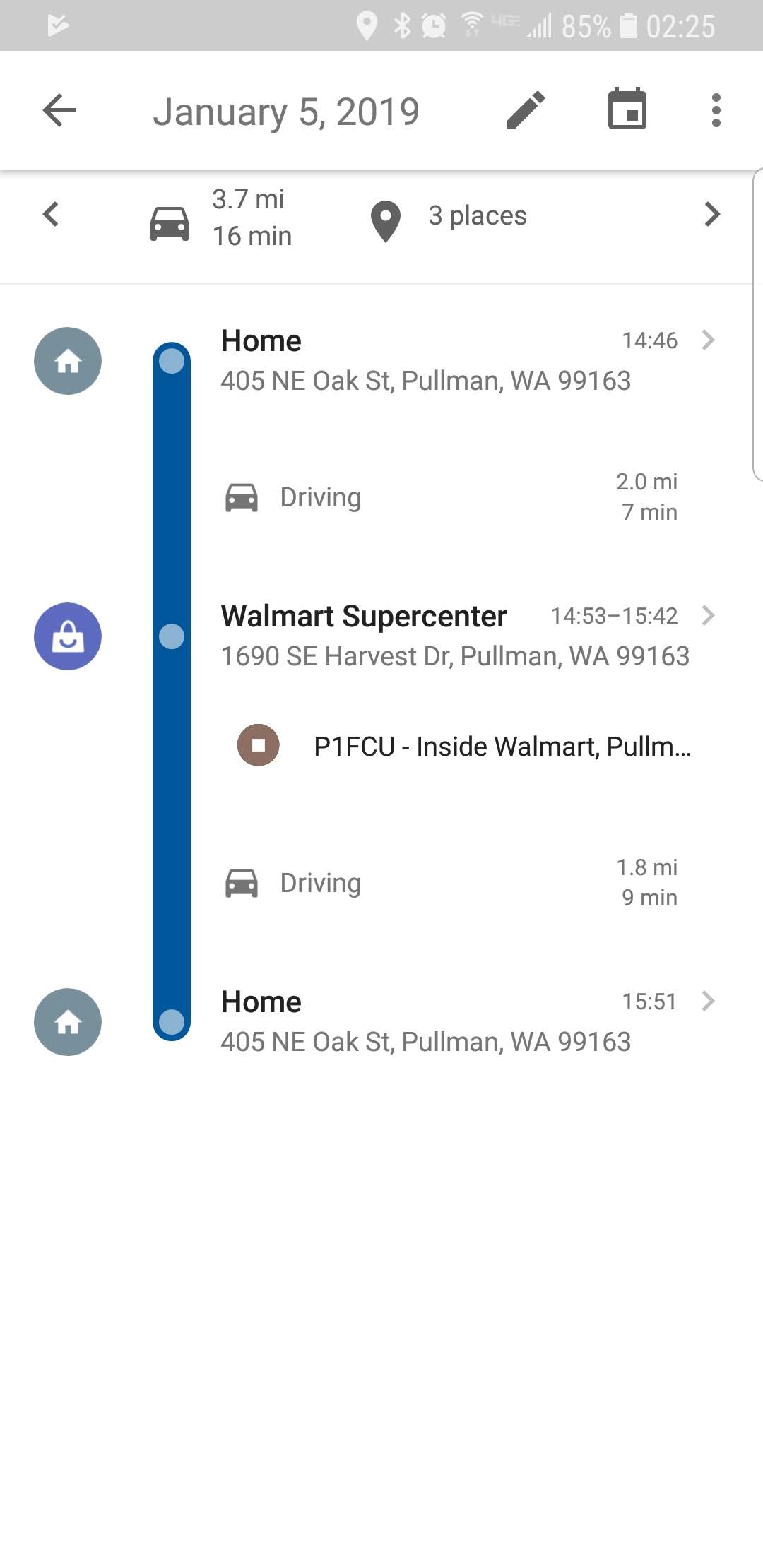 January 4th, 2019:I drove to the OKC airport, caught a connecting flight in SLC, landed in Spokane, and then drove home. Google knew I was flying because of the speed my phone was moving, and it was able to place me in a specific location as well.