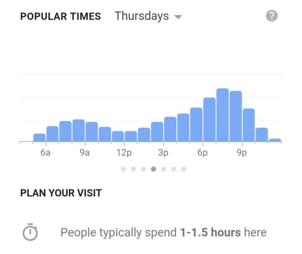 Another nifty thing Google can tell you based on phone location and density, is how busy a location currently is, when a location is normally busy, and when the busiest times are.
