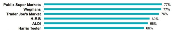 The leading Supermarket was H-E-B, with an 82% Temkin Trust Rating,and it is not only the highest rated supermarket, but it is also rated a #1 most trusted company. Now, if you are unfamiliar with this chain, that is probably because it is a Texas and Mexico based supermarket (and a fantastic one at that).